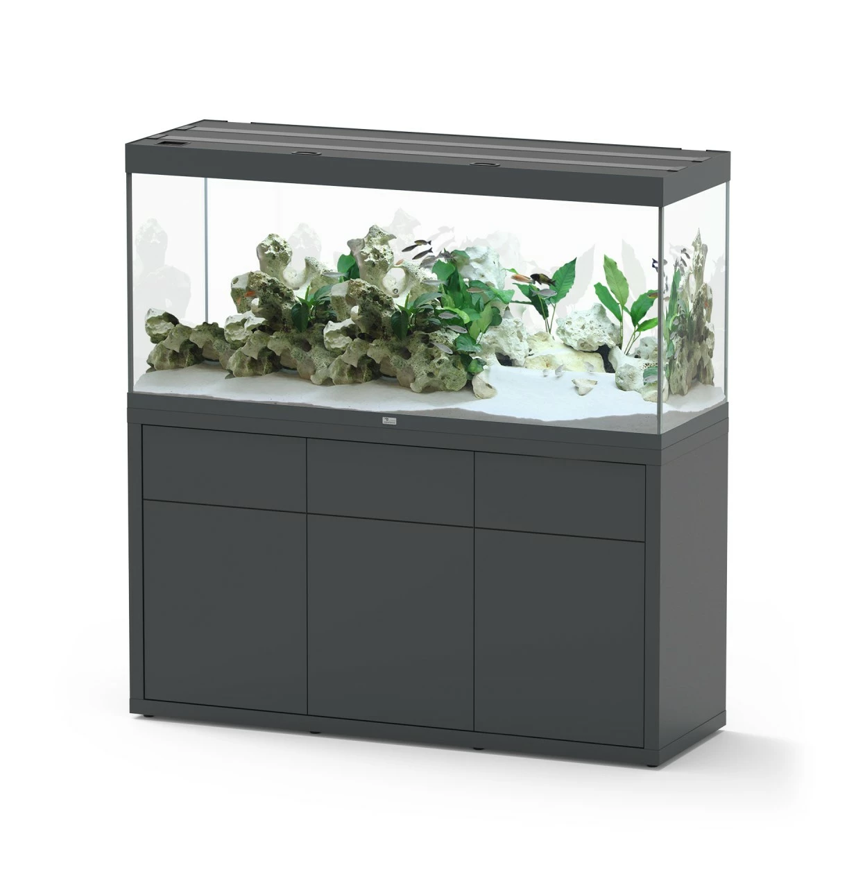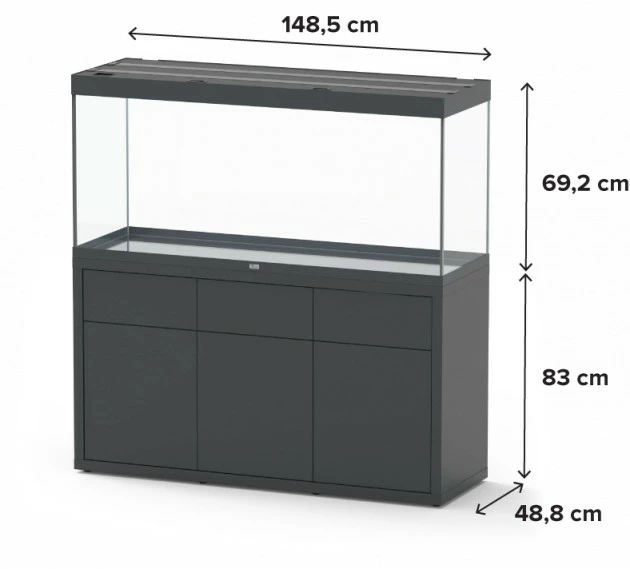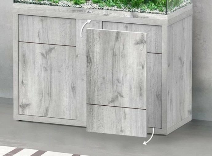 Der Unterschrank ist robust und langlebig und bietet viel Stauraum für Zubehör und Futter. Er ist in der gleichen Farbe wie das Aquarium gehalten und passt perfekt zu dessen Design. Der Schrank verfügt über Türen, die diskret und leise schließen, und verhindert so, dass Ihre Fische gestört werden.