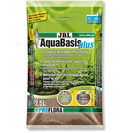 JBL ProFlora AquaBasis plus can be compared to a charged battery : the nutrient substrate immediately supplies the energy (nutrients such as iron) for the plants and can be recharged with the help of liquid fertilizers should it run out. The nutrient substrate can remain in the aquarium for up to 5 years. The clay components it contains store nutrients and release them back to the plants as needed.
