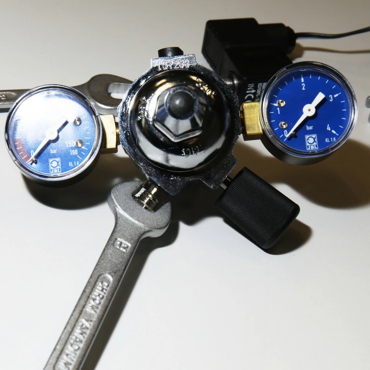 Since plants only need CO2 for photosynthesis during the lighting phase, you can turn off the CO2 supply at night. To relieve you from turning on and off the CO2 bottle, there are solenoid valves (JBL PROFLORA v002) that can be controlled by a timer. The timer then switches on the light and the CO2 supply via the solenoid valve in the morning and switches both off again in the evening. Clever calculators immediately recognize that the expense for a solenoid valve quickly pays for itself, since half of the CO2 is saved. It is always installed between the pressure reducer and the check valve. If you want to use a pH computer with automatic CO2 control, you also need a solenoid valve. This is then not switched via the timer, but via the pH control unit (JBL PROFLORA pH-Control Touch).