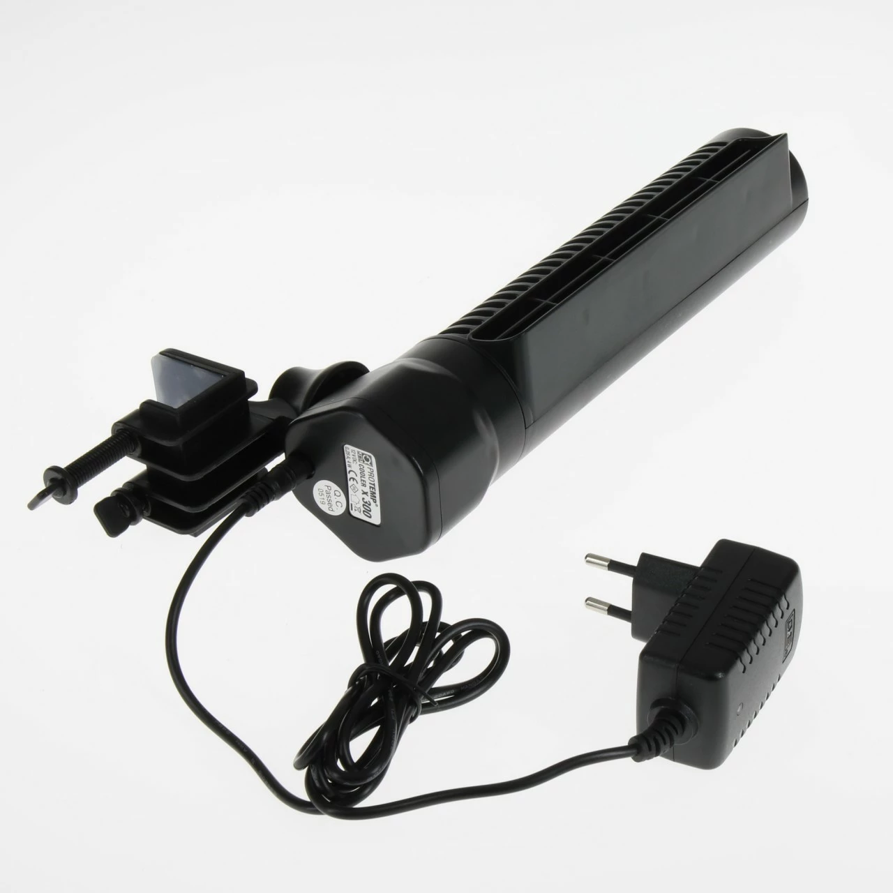 The holder of the cooling fan is placed on the edge of the aquarium (up to max. 2.4 cm thickness) and fixed with clamping screws.