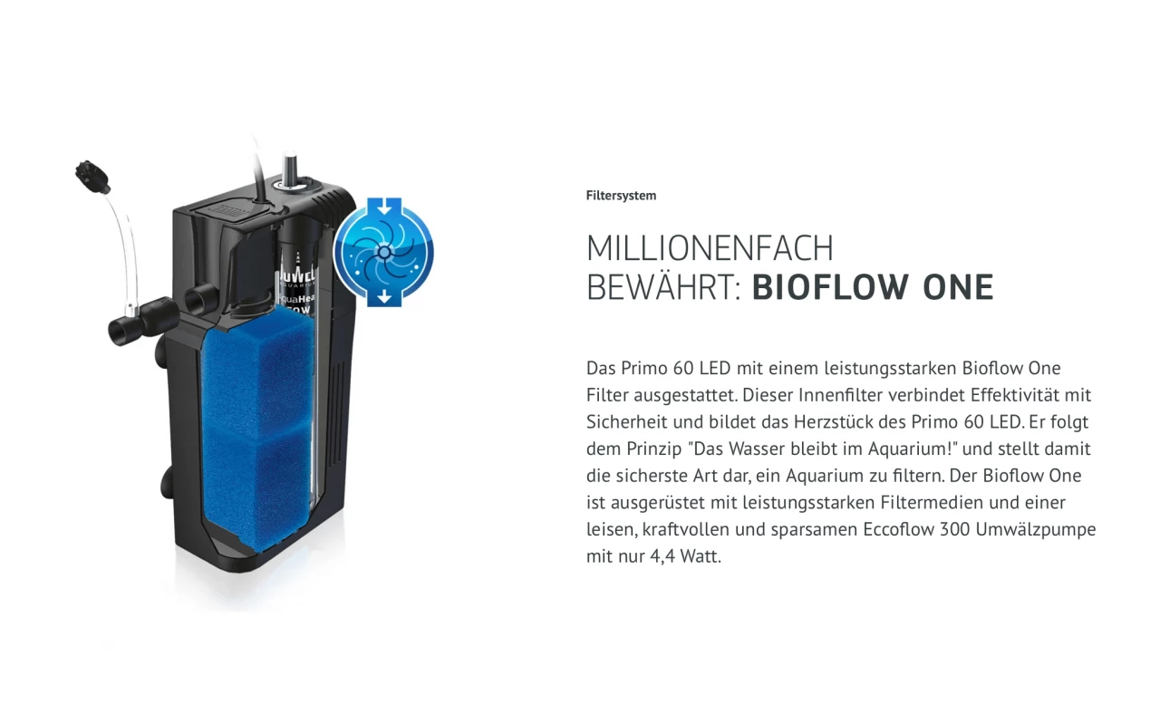 The complete aquarium is equipped with a powerful Bioflow One filter system . The internal filter, which combines effectiveness and safety, is equipped with two fine-pored filter media and a quiet but powerful circulation pump . Invisibly integrated into the water circuit and ensuring the correct temperature in the Juwel aquarium, you get a AquaHeat control heater right along with it.