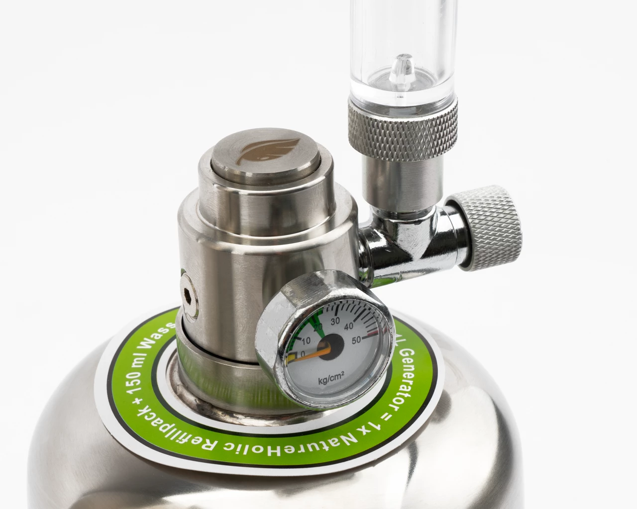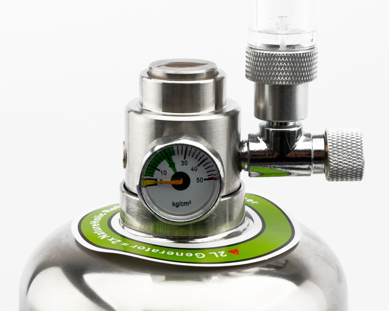 The CO2 generator bottle made of stainless steel for the supply of an aquarium with CO2 works with citric acid, which is decomposed in the pressure bottle by a controlled chemical reaction to CO2. We recommend the use of our CO2 Refill Packs for the generator – here the necessary components are already available in high quality and in the correct, safe ratio and you do not have to laboriously mix yourself.