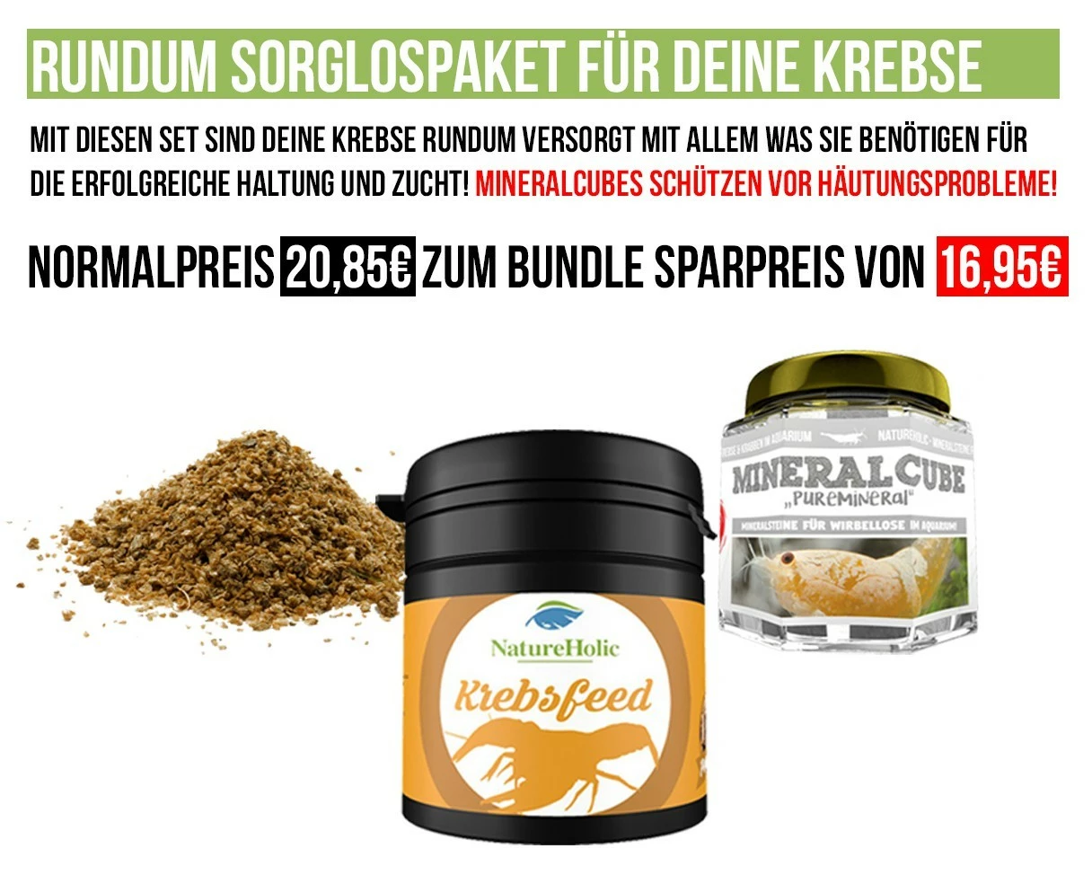 | Feeding: | 1-2 times daily as much NatureHolic Krebsfeed as is eaten within a few minutes / 1-2 times weekly as many water fleas as are ingested within a few minutes / 1 MineralCube per 10 l tank volume, replace when used up |