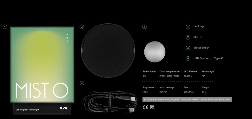 USB adapter is not included in the package. A 5V-2A USB Type C adapter is required! The MISTO is magnetic and comes with mounting hardware in the form of a sleek steel disk that allows the unit to be easily and securely attached to any desired surface. Its small footprint and powerful light spectrum are perfect for smaller nano aquariums or terrestrial planted displays. The MISTO can be used on cabinets, shelves, display cases and more. Installation is simple: remove the protective film from the glass, stick it where you want it and place the MISTO unit. The magnetic hold is strong and secure! Similar to other ONF LED lights, the MISTO has 4 levels of incremental dimming via a touch sensor button. Preferred color temperature between 2700 K, 4000 K and 7000 K can also be selected via the second touch sensitive button on the unit. This makes the ONF MIST O arguably one of the most versatile, compact plant lights on the market! Brightness and color temperature settings are stored by MISTO in the event of a power failure.