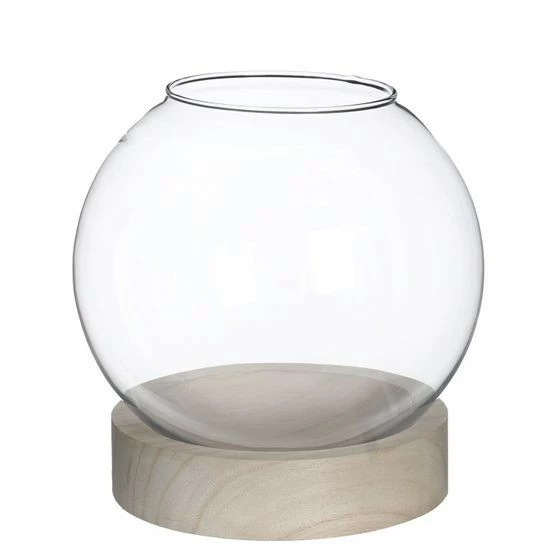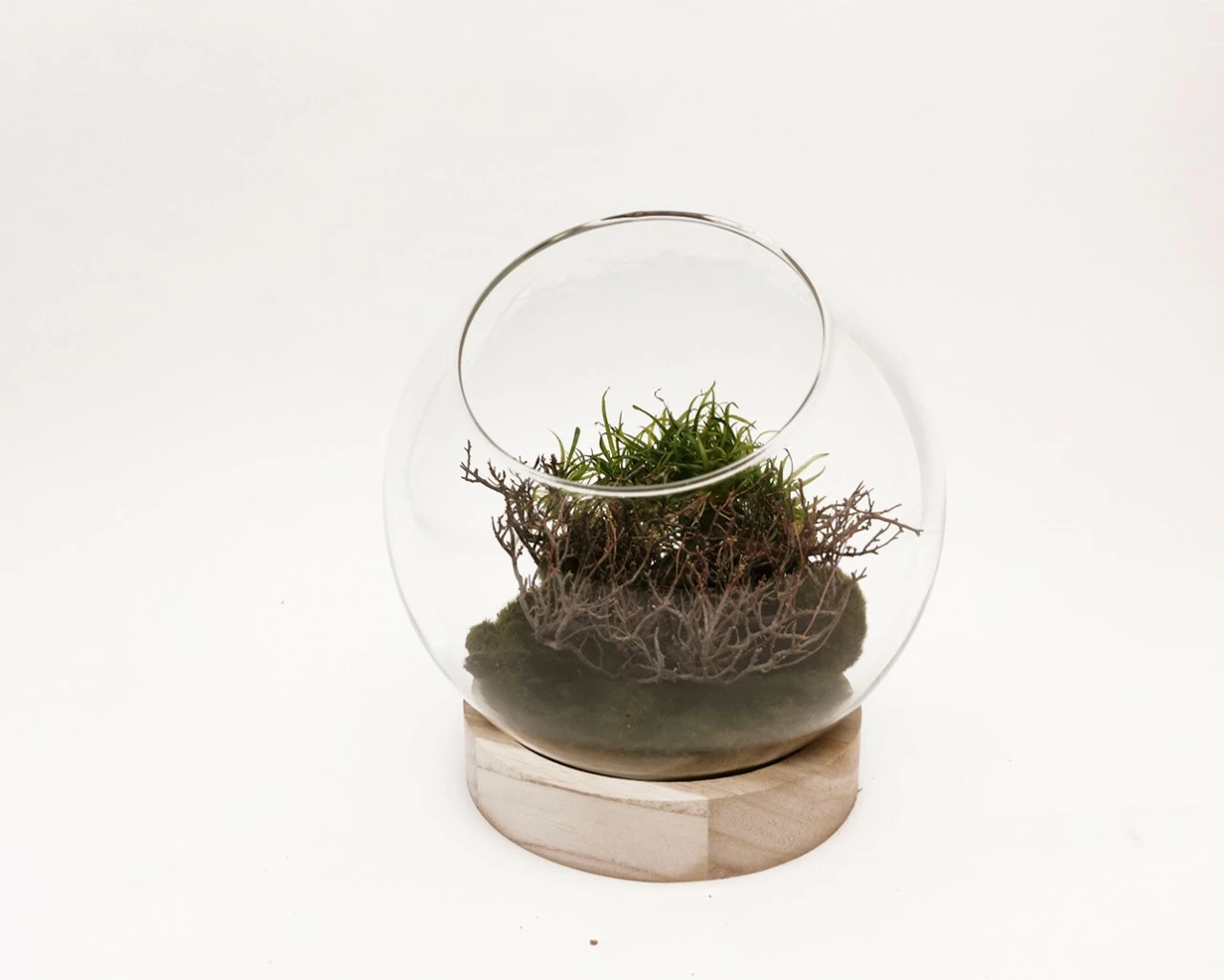 The pretty NatureHolic Wabi Kusa sphere vase sits on a glazed wooden base and has a diameter of 20 cm. The planted NatureHolic sphere vase is best operated near a natural light source (bright, but not in full sun) or illuminated with a separately available plant light, so that the plants can grow well in it. Of course, you can also use the sphere vase as an actual vase for cut flowers and bouquets!